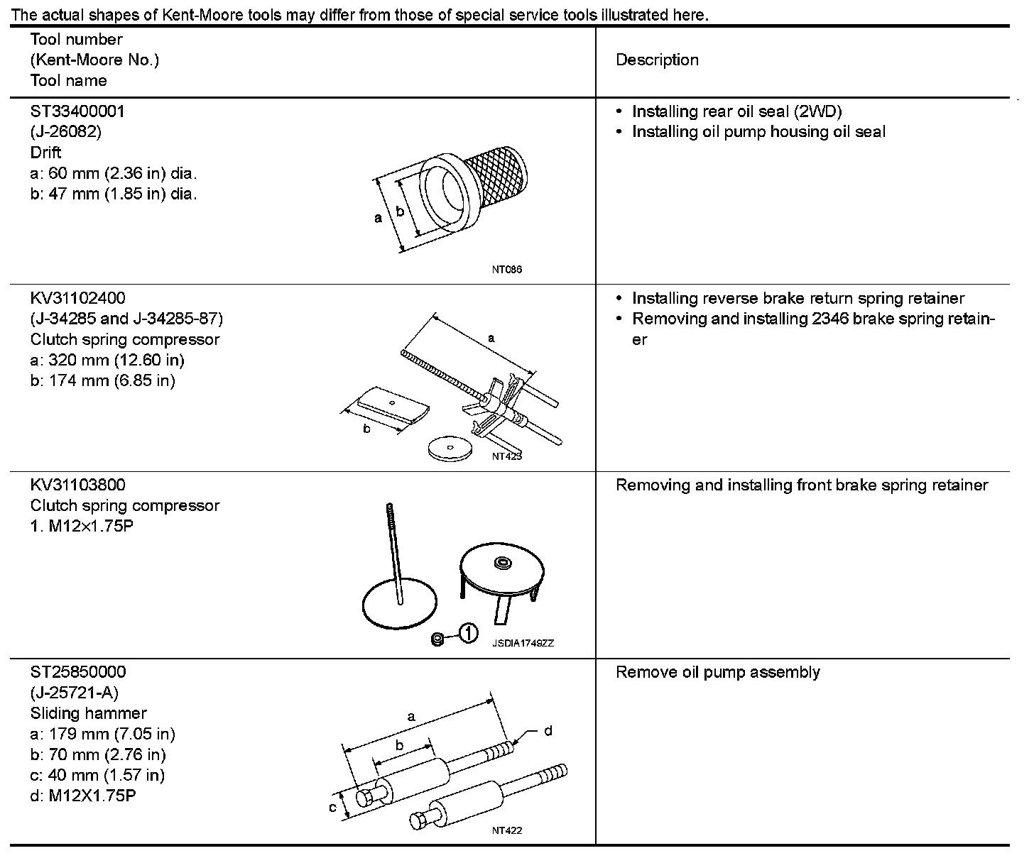 The actual shapes of Kent-Moore tools may differ from those of special service tools illustrated here.