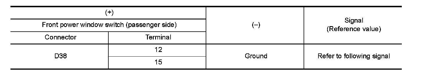 2.Check signal between front power window switch (passenger side) harness connector and ground with oscilloscope.