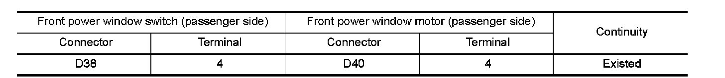 3.Check continuity between front power window switch (passenger side) harness connector and front power window motor (passenger side) harness connector.