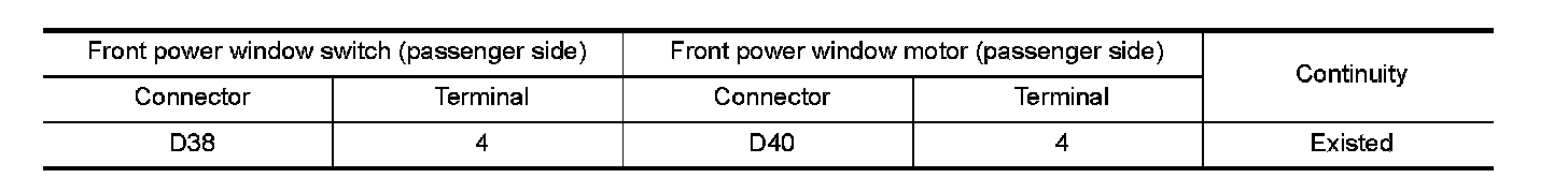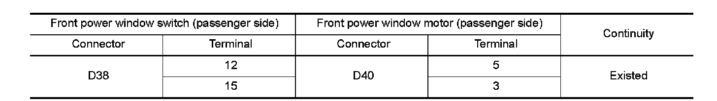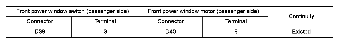 3.Check continuity between front power window switch (passenger side) harness connector and front power window motor (passenger side) harness connector.