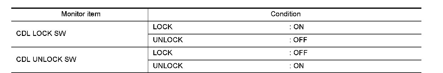 Check ("CDL LOCK SW ", "CDL UNLOCK SW") in "DATA MONITOR" mode for "POWER DOOR LOCK SYSTEM" with CONSULT. Refer to "DOOR LOCK : CONSULT Function (BCM DOOR LOCK)" CONSULT Function.