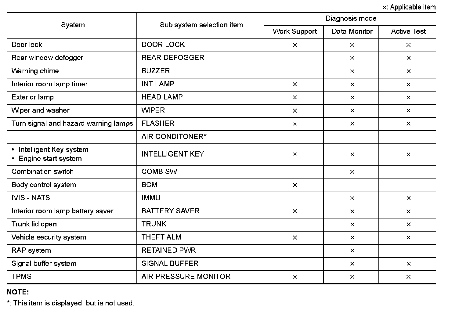 It can perform the diagnosis modes except the following for all sub system selection items.