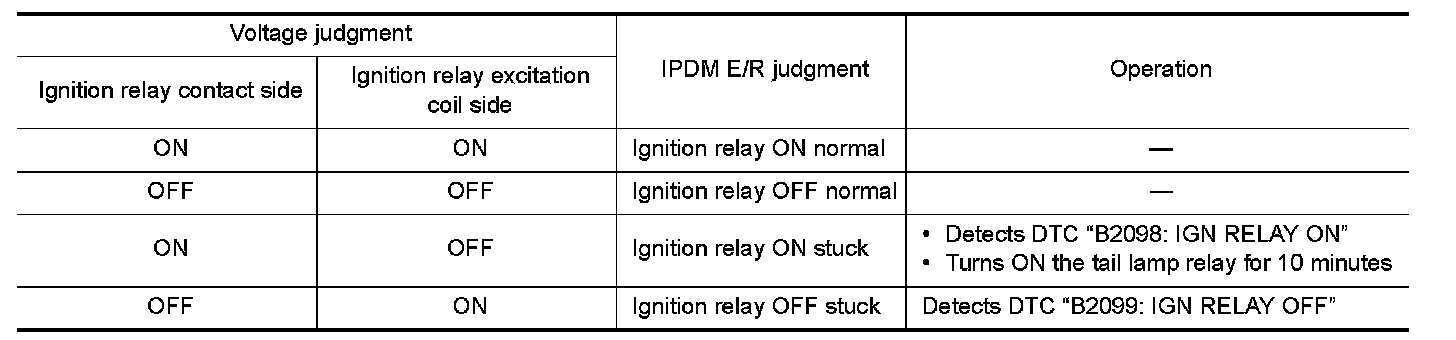 - IPDM E/R judges the ignition relay error if the voltage differs between the contact circuit and the excitation coil circuit.