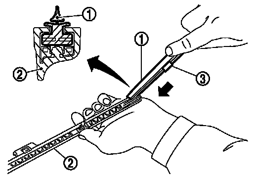 2.Insert the tip of new wiper refill (1) into the rear end of wiper blade (2). Slide the new wiper refill to the direction shown by the arrow while pressing the new wiper refill onto the wiper blade rear end.