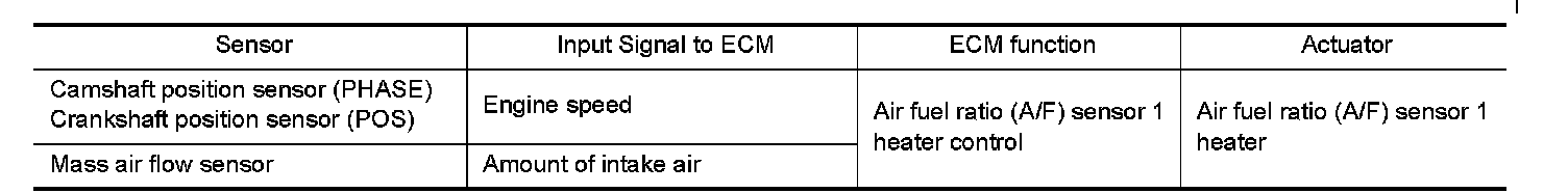The ECM performs ON/OFF duty control of the A/F sensor 1 heater corresponding to the engine operating condition to keep the temperature of A/F sensor 1 element at the specified range.