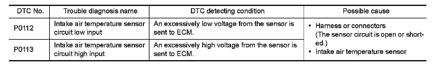The intake air temperature sensor is built-into the mass air flow sensor (1). The sensor detects intake air temperature and transmits a signal to the ECM.