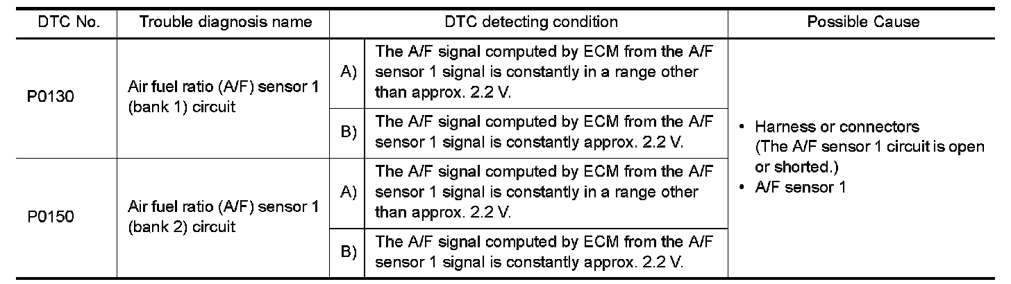 Replace malfunctioning air fuel ratio (A/F) sensor 1. Refer to "Exploded View" Exploded View.