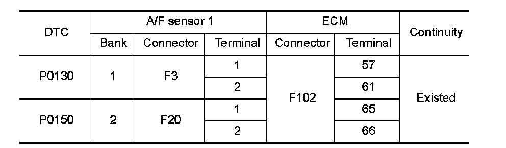 3.Check the continuity between A/F sensor 1 harness connector and ECM harness connector.