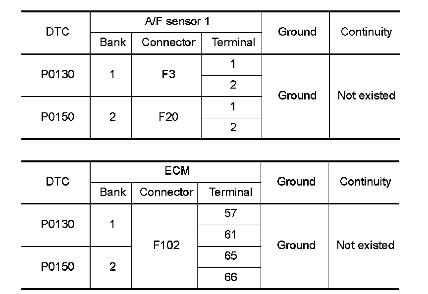 4.Check the continuity between A/F sensor 1 harness connector and ground, or ECM harness connector and ground.