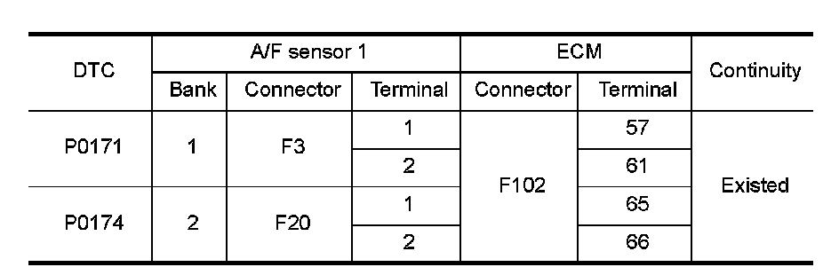 4.Check the continuity between A/F sensor 1 harness connector and ECM harness connector.