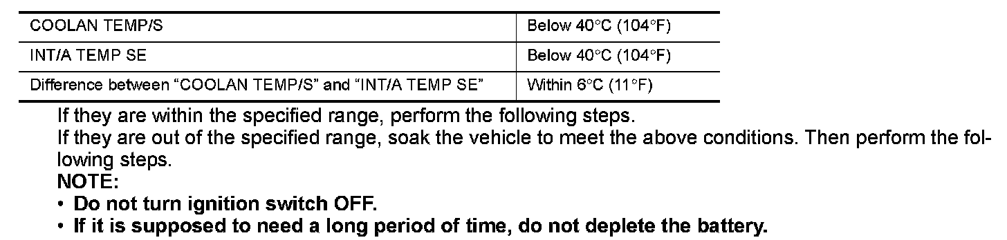 If they are out of the specified range, soak the vehicle to meet the above conditions. Then perform the following steps.