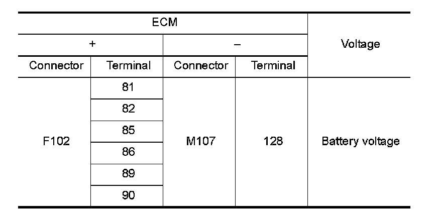 2.Check the voltage between ECM harness connector terminals as per the following.