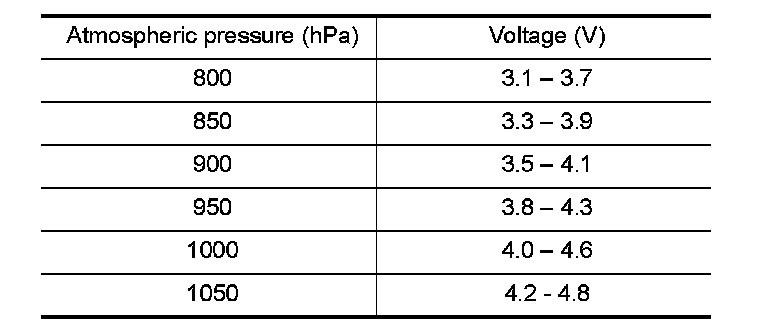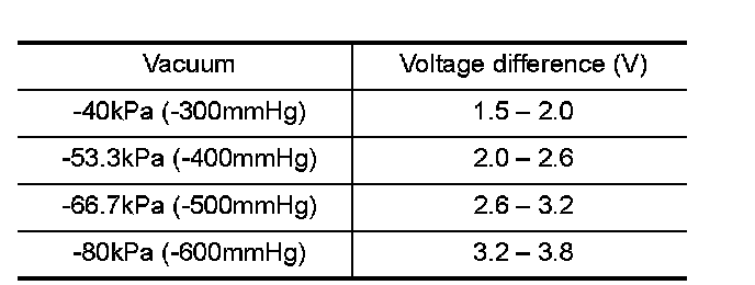 6.Check that the difference of the voltage when engine is stopped and that when negative pressure is applied with vacuum pump is within the following limits.