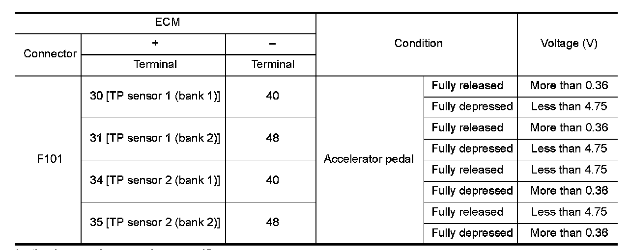 The throttle position sensor has two sensors. These sensors are a kind of potentiometer which transform the throttle valve position into output voltage, and emit the voltage signals to the ECM. The ECM