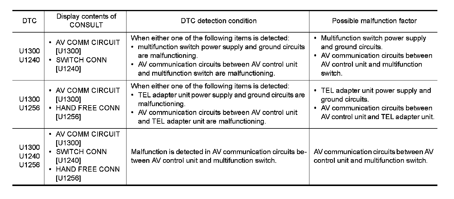 U1300 is indicated when malfunction occurs in communication signal of multi AV system. Indicated simultaneously, without fail, with the malfunction of control units connected to AV control unit with communication line.
