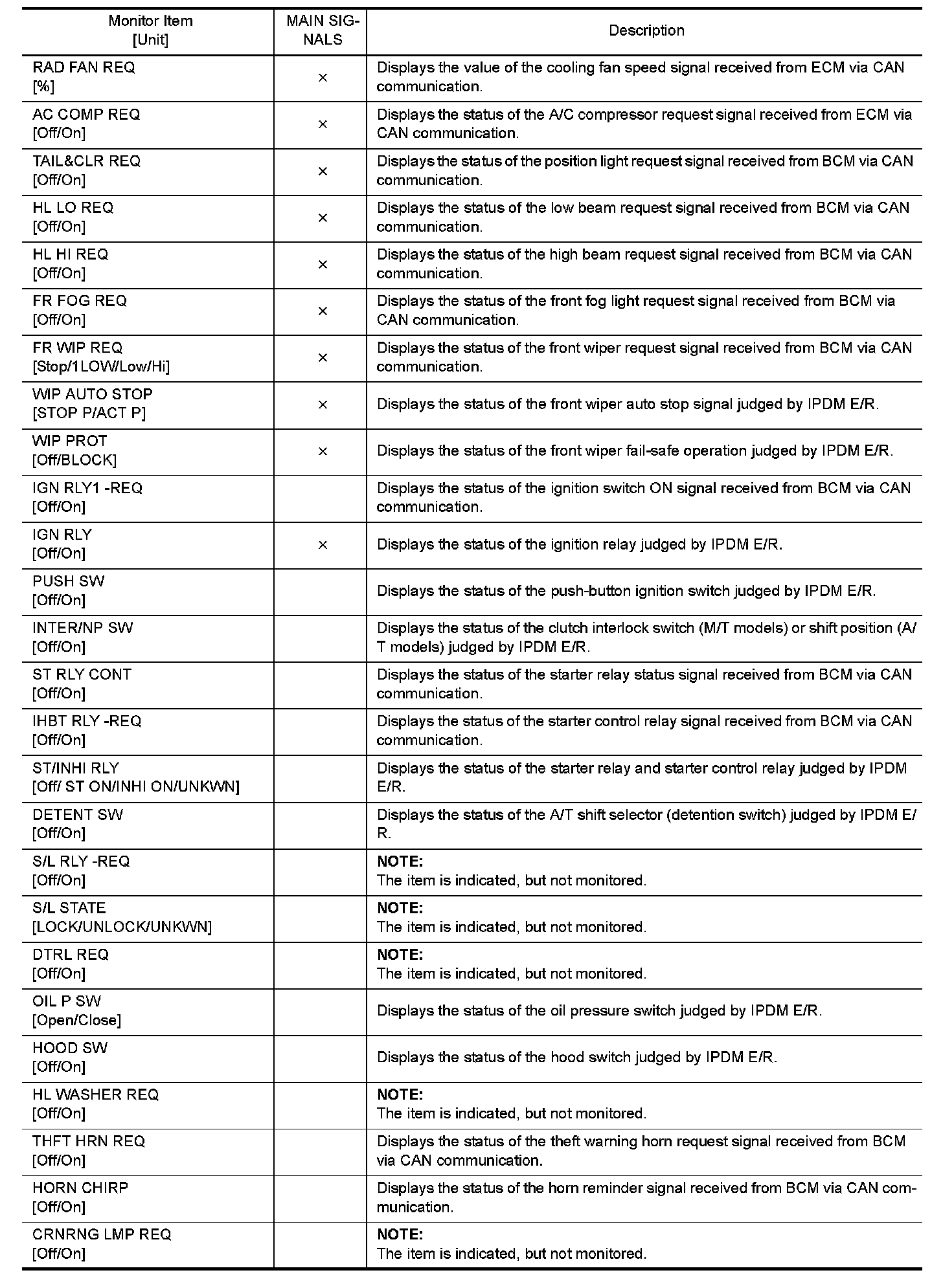 The following table includes information (items) inapplicable to this vehicle. For information (items) applicable to this vehicle, refer to CONSULT display items.