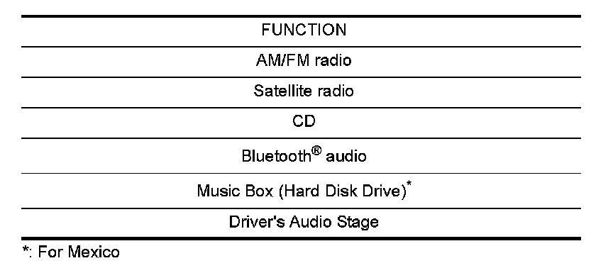The audio system is equipped with the following functions. Each function is operated with multifunction switch, preset switch, touch panel, steering switch or audio recognition. Operation status of audio is indicated at display.