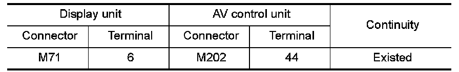 3.Check continuity between display unit harness connector and AV control unit harness connector.