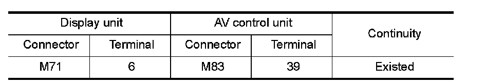 3.Check continuity between display unit harness connector and AV control unit harness connector.