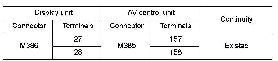 3.Check continuity between display unit harness connector and AV control unit harness connector.