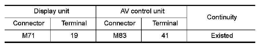 3.Check continuity between display unit harness connector and AV control unit harness connector.