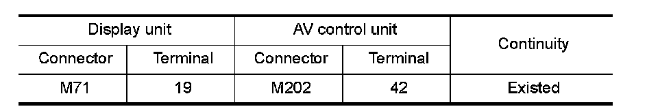 3.Check continuity between display unit harness connector and AV control unit harness connector.