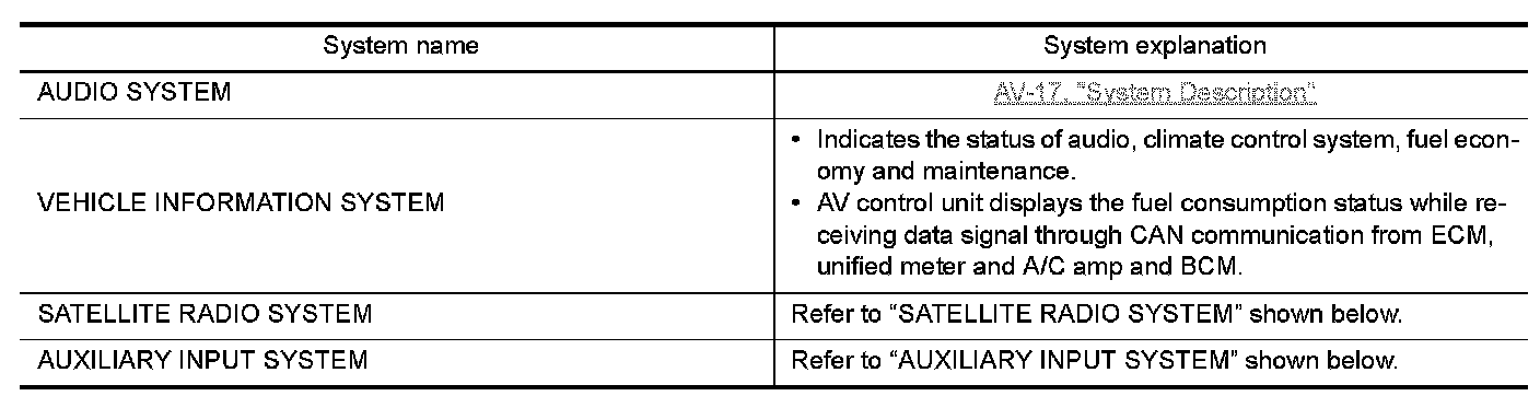 - AV control unit is connected by CAN communication, and it receives data signal from ECM, unified meter and A/C amp. It computes and displays fuel economy information value with the obtained information. Transmitting/receiving of data signal is performed by BCM. Also, it transmits the required signal of vehicle setting and receives the response signal.