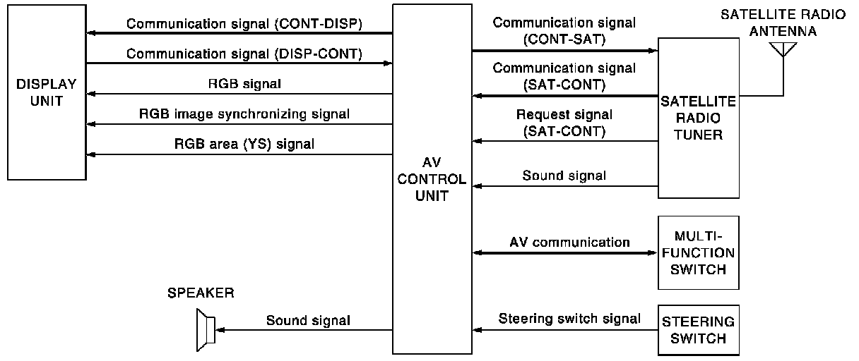 - Audio signal (satellite radio) is received by satellite antenna and transmitted to AV control unit. AV control unit is output the audio signal (satellite radio) to each speaker.