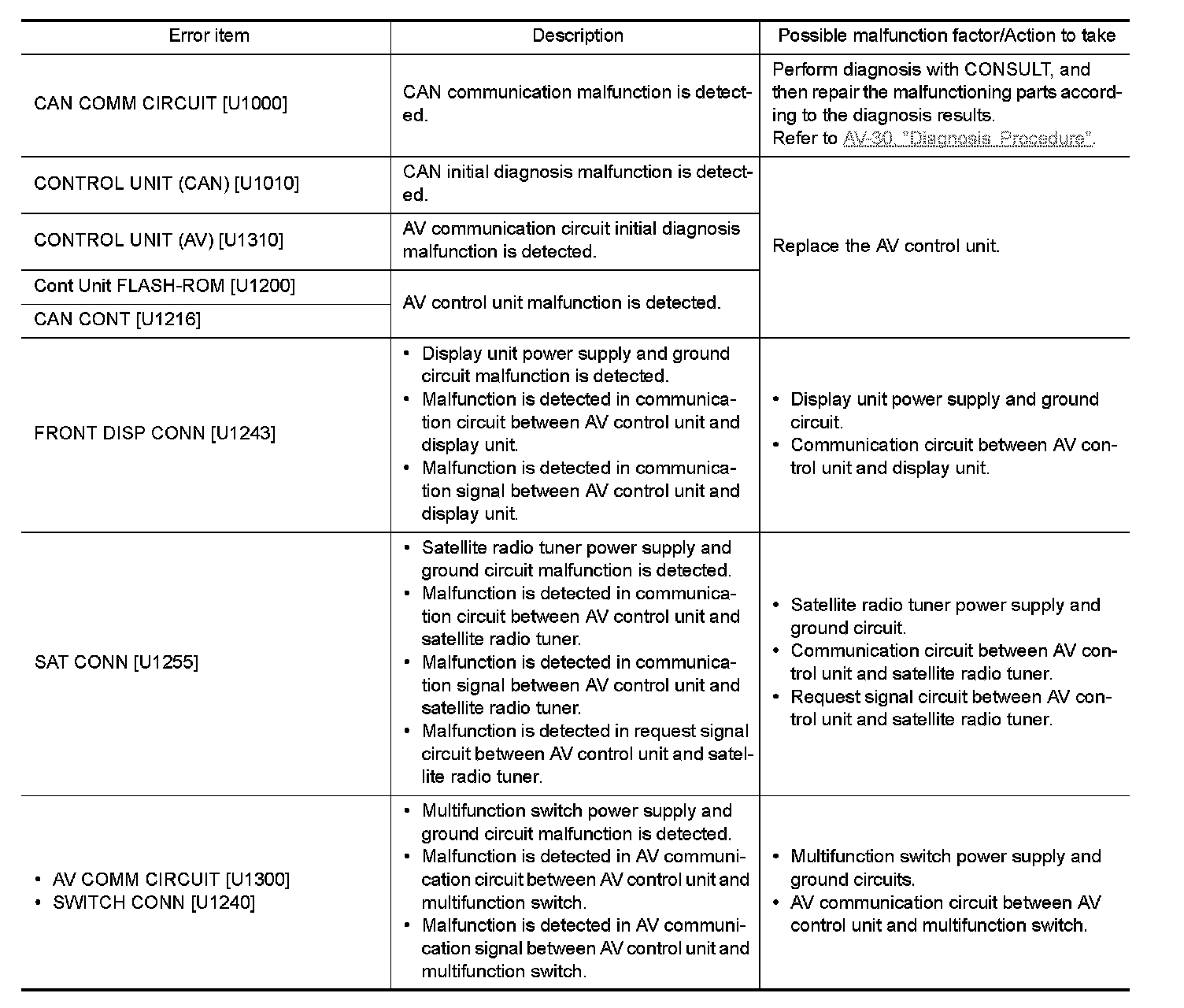 CONSULT performs the following functions via the communication with the AV control unit.