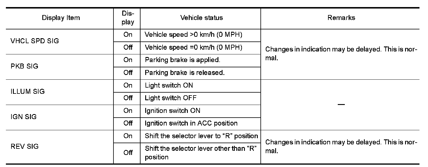 - Displays the status of the following vehicle signals inputted into the AV control unit.