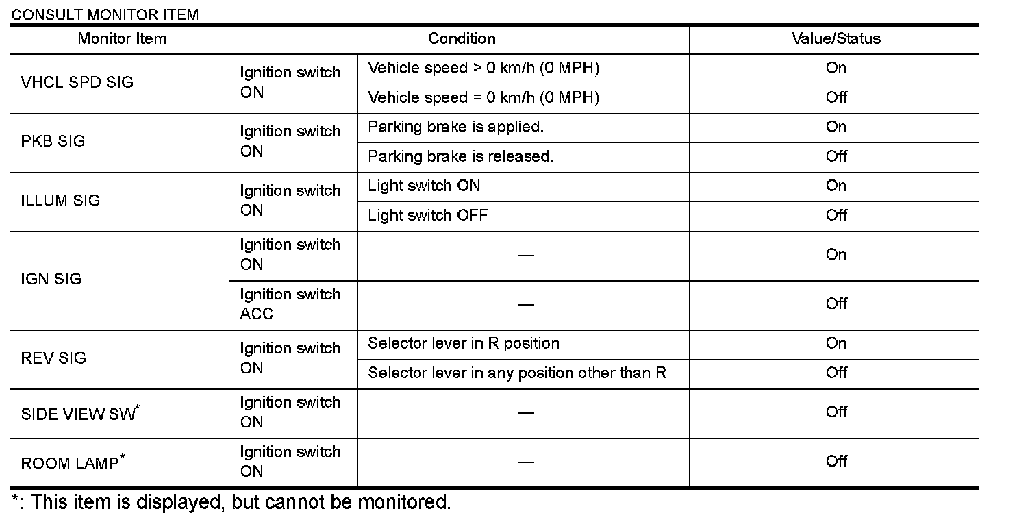 The following table includes information (items) inapplicable to this vehicle. For information (items) applicable to this vehicle, refer to CONSULT display items.