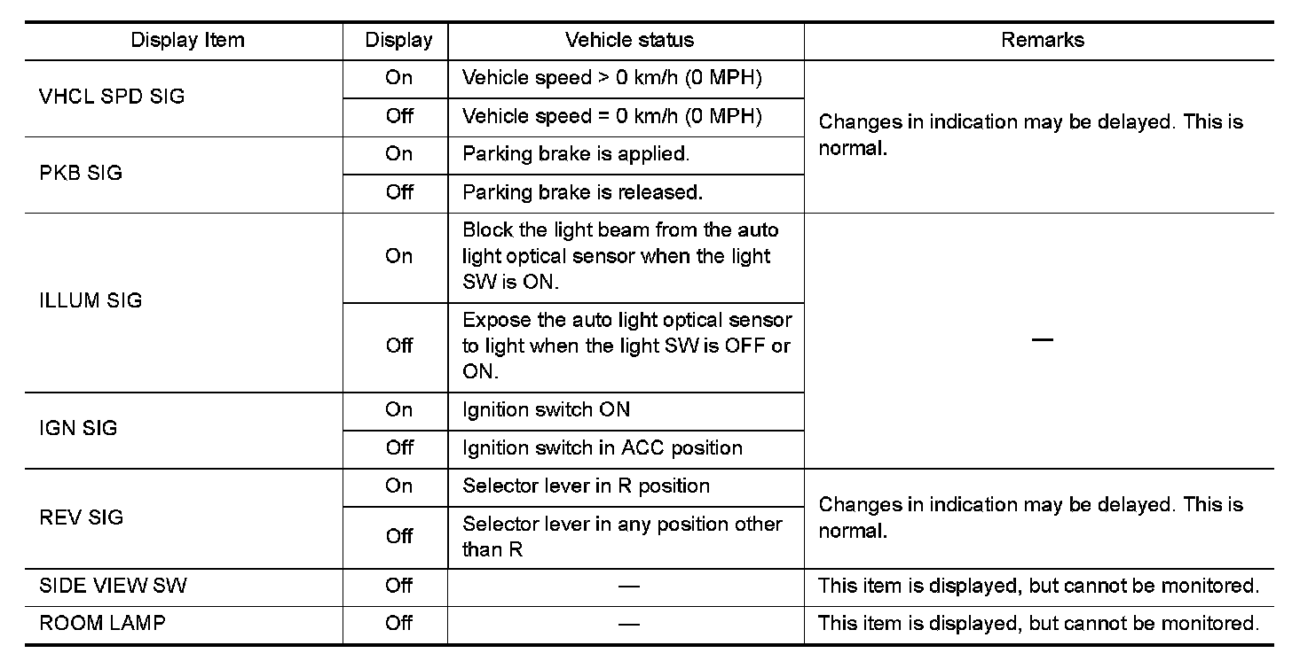 - Displays the status of the following vehicle signals inputted into the AV control unit.