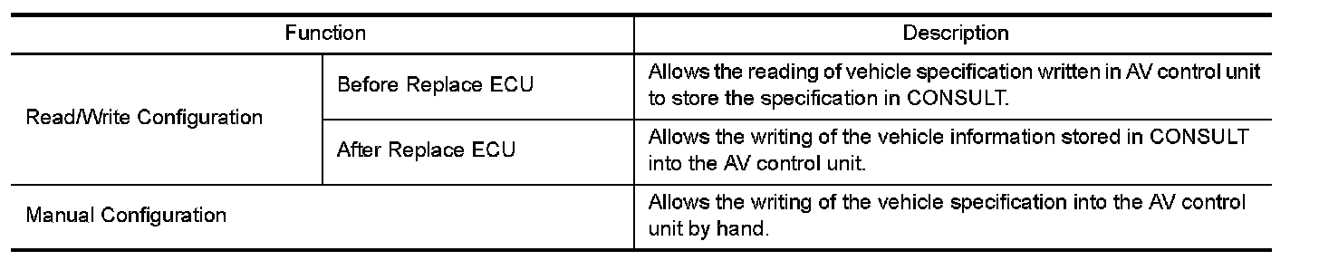CONSULT performs the following functions via the communication with the AV control unit.