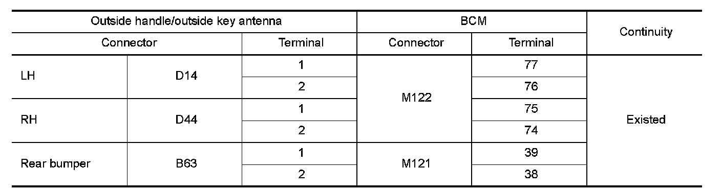 2.Check continuity between malfunctioning outside handle or outside key antenna harness connector and