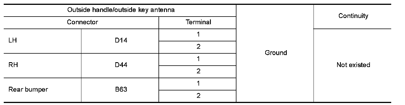 3.Check continuity between malfunctioning outside handle or outside key antenna harness connector and ground.