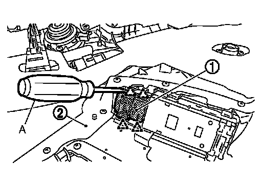 2.Remove door mirror remote control switch (1) from power window main switch finisher (2) using remover tool (A).