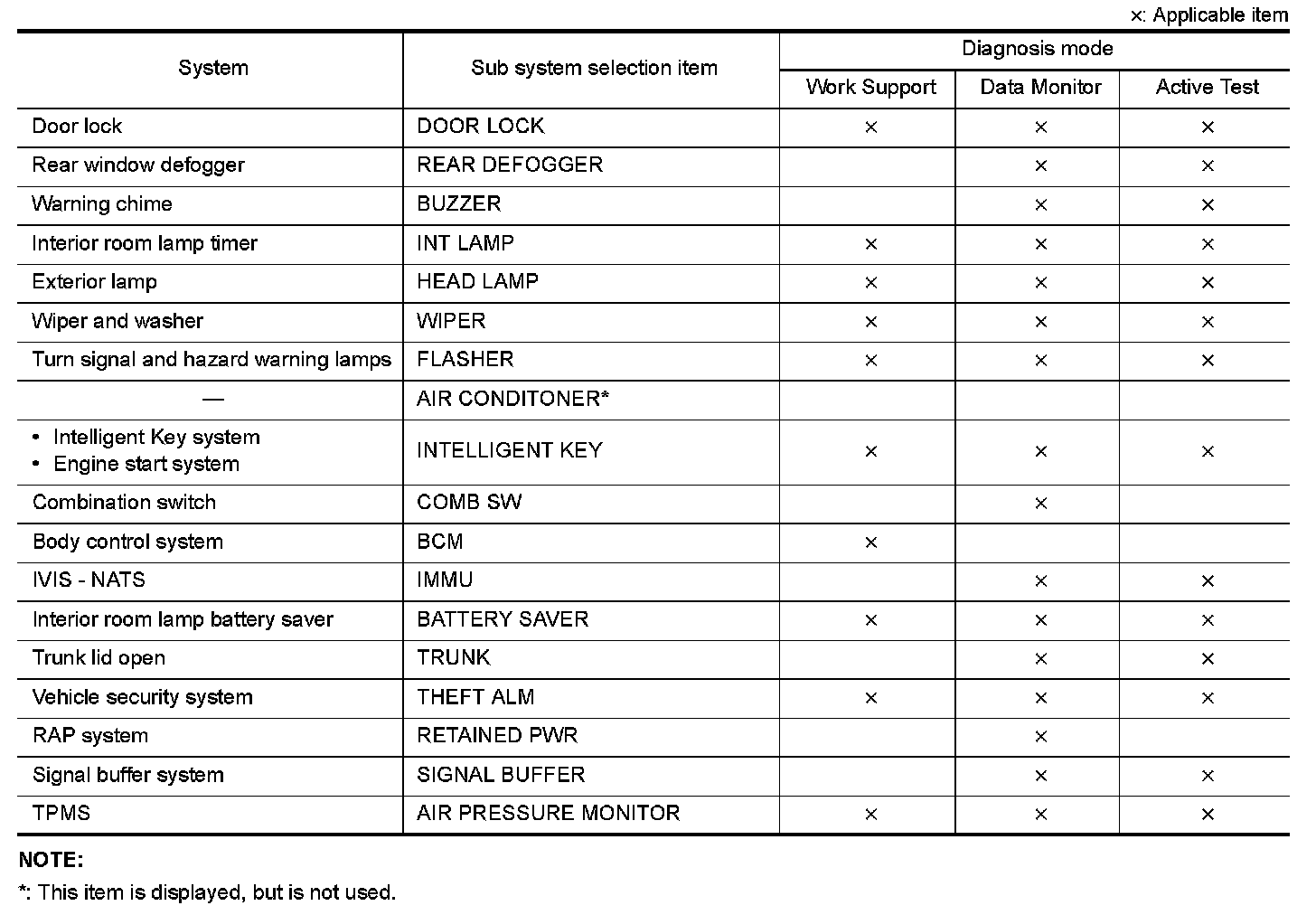 It can perform the diagnosis modes except the following for all sub system selection items.