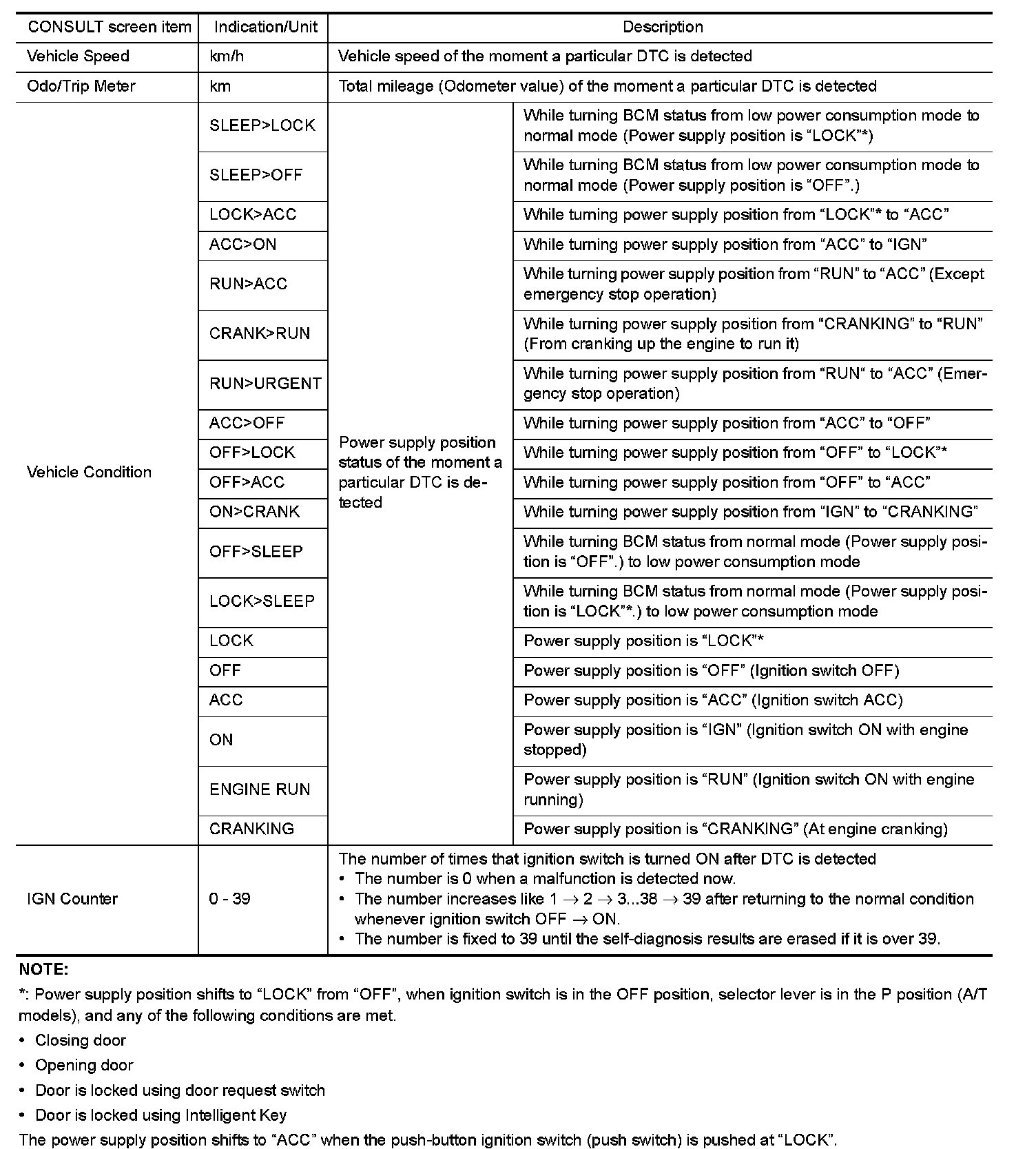 The BCM records the following vehicle condition at the time a particular DTC is detected, and displays on