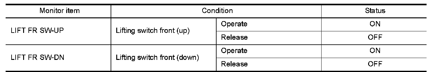 2.Select "LIFT FR SW-UP", "LIFT FR SW-DN" in the "Data monitor" mode using CONSULT.