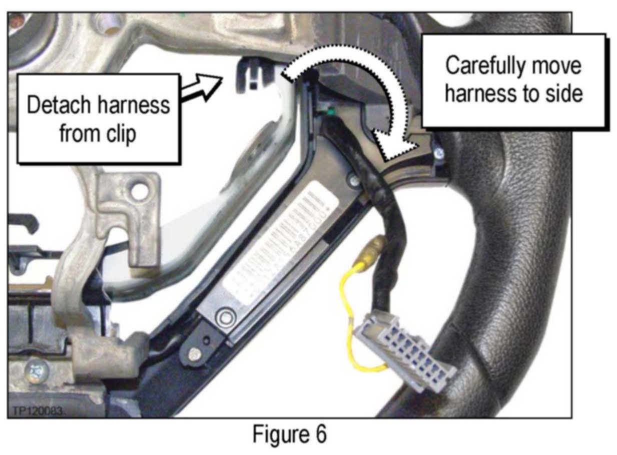 7. Turn over the steering wheel assembly and detach the harness from the clip.