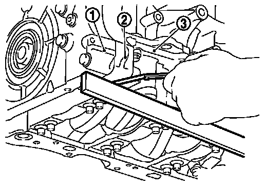 - After installing front timing chain case, check the surface height difference between the following parts on the oil pan (upper) mounting surface.