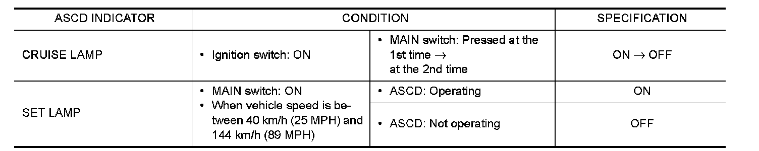 ASCD operation status is indicated by two indicators (CRUISE and SET) and CRUISE lamp in combination meter.