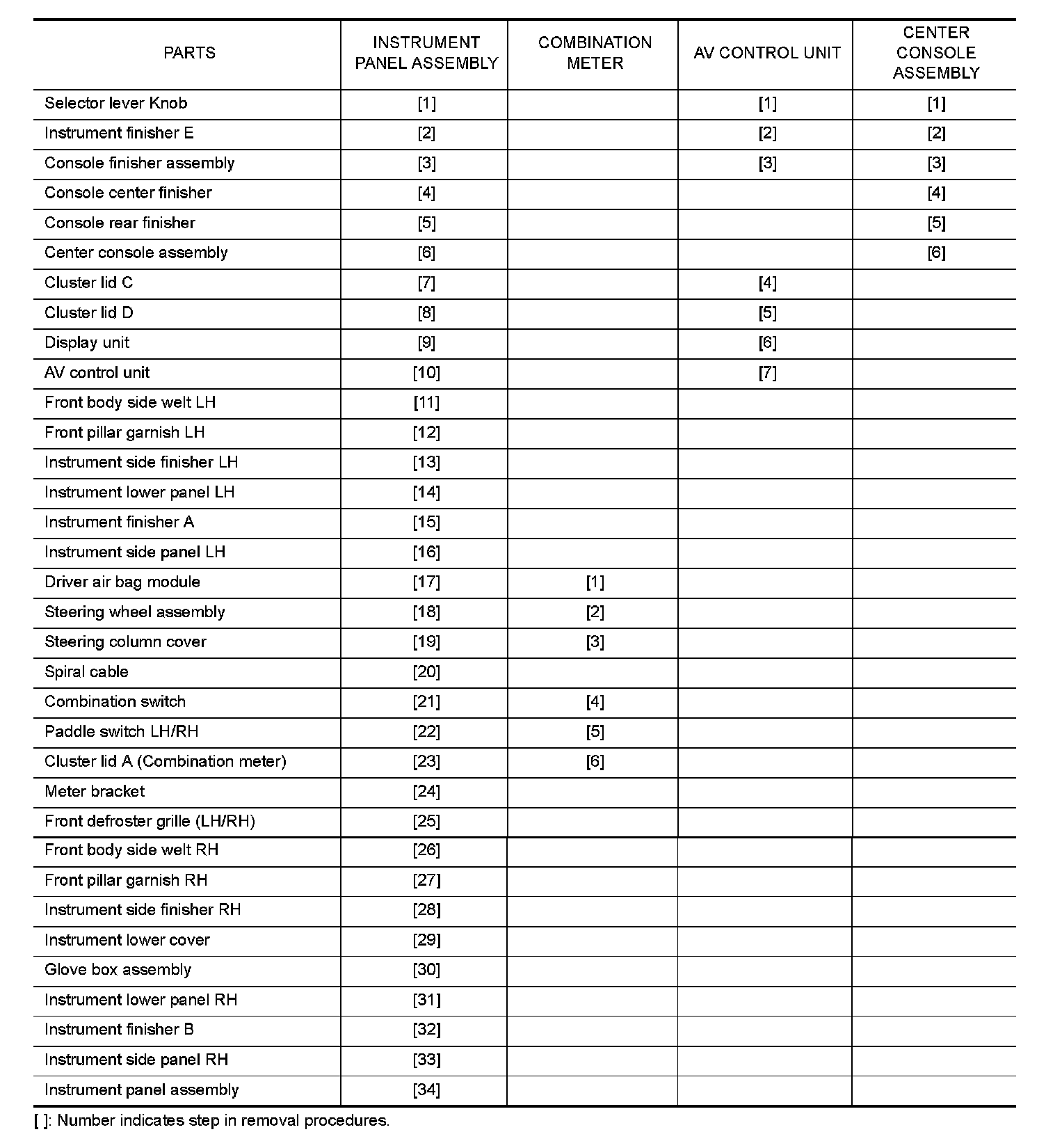 When removing instrument panel assembly, combination meter, AV control unit, center console assembly take steps in the order shown by the number below.