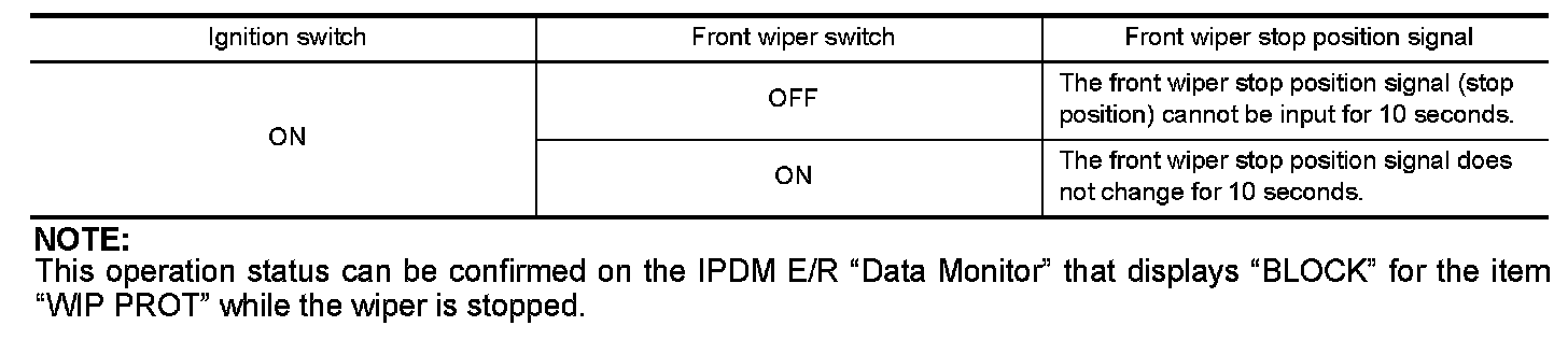 When a front wiper stop position signal is in the conditions listed below, IPDM E/R stops power supply to wiper after repeating a front wiper 10 seconds activation and 20 seconds stop five times.