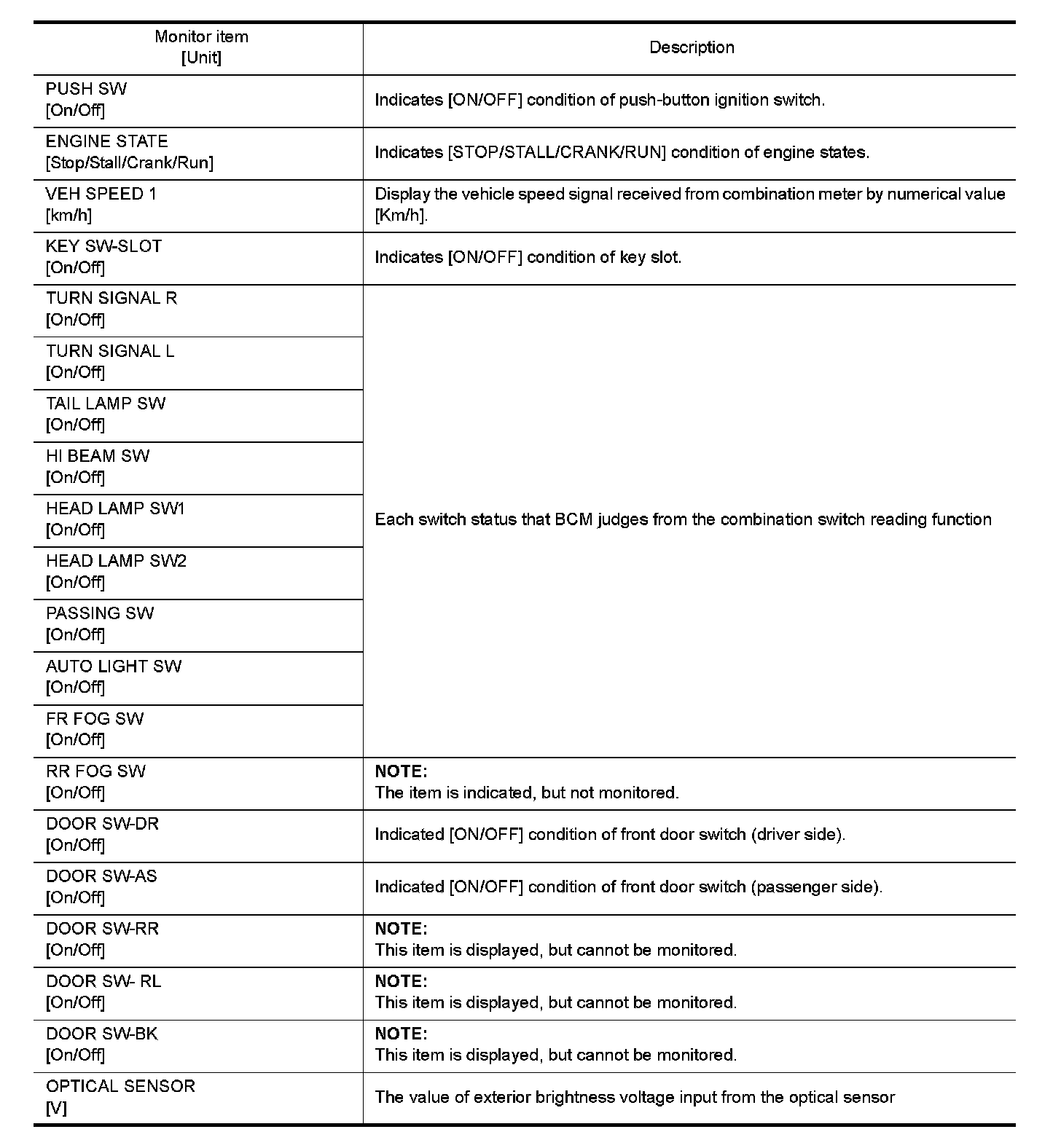 The following table includes information (items) inapplicable to this vehicle. For information (items) applicable to this vehicle, refer to CONSULT display items.