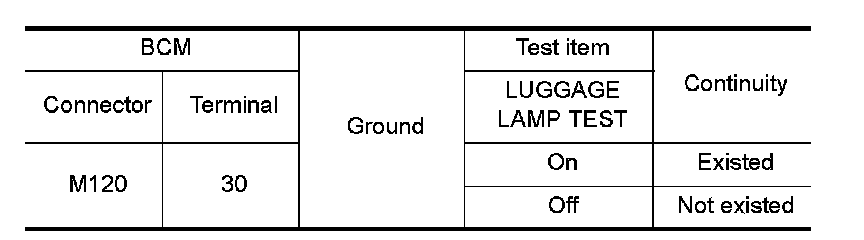 3.With operating the test items, check that trunk room lamp turns ON/OFF.