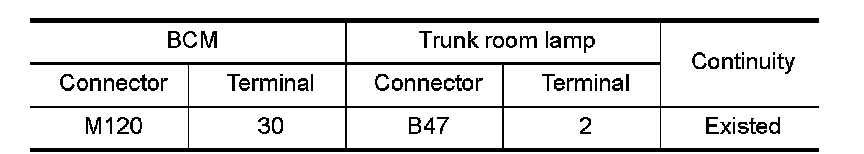 3.Check continuity between BCM harness connector and trunk room lamp harness connector.