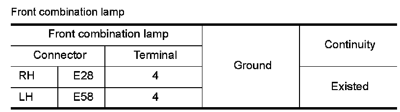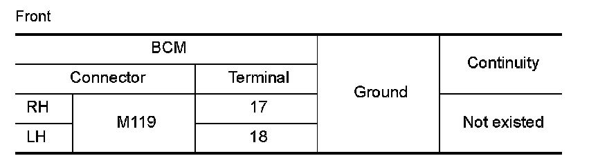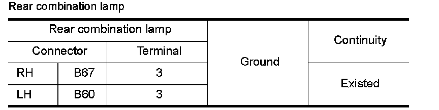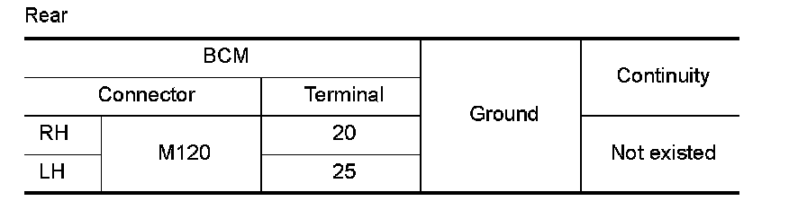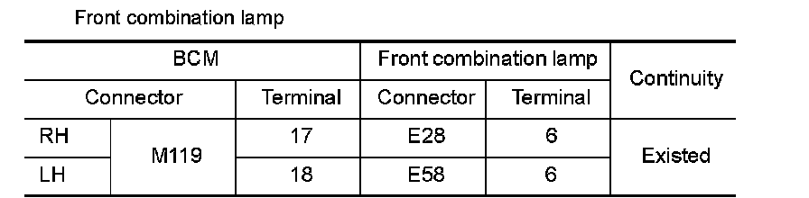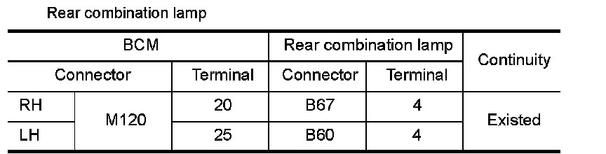 3.Check the continuity between the BCM harness connector and the front combination lamp or the rear combination lamp harness connector.