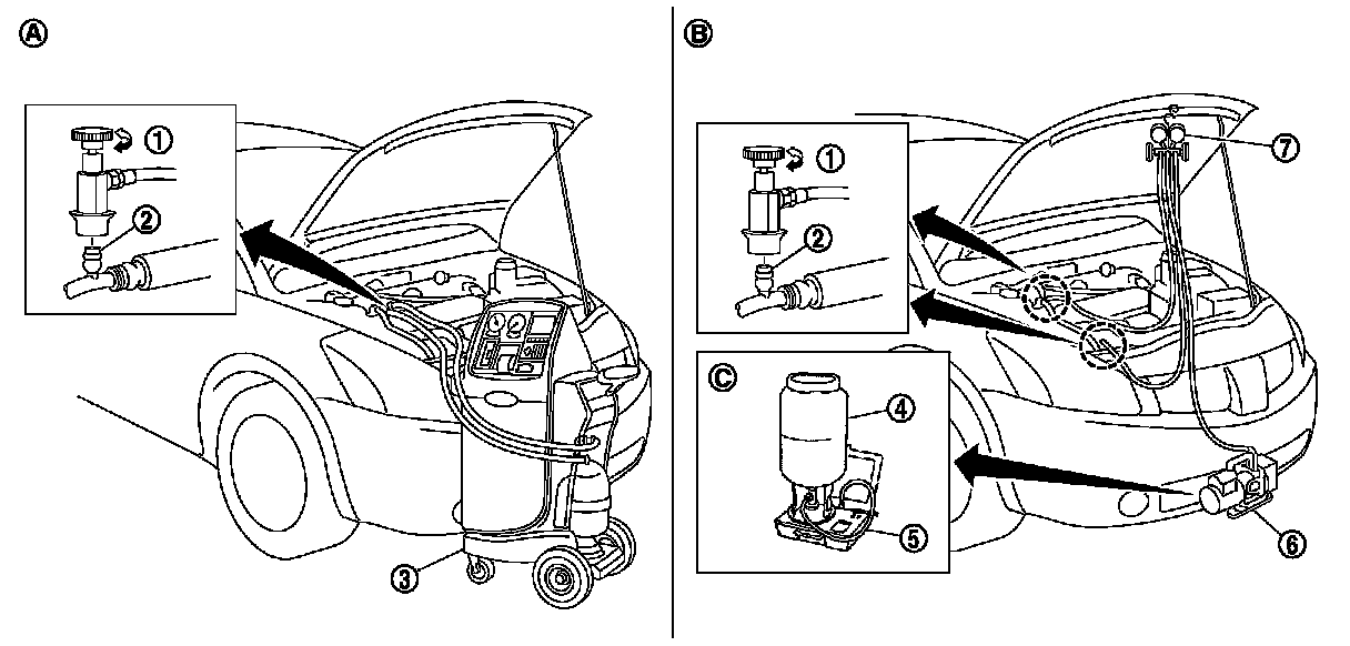 1.Connect refrigerant recovery/recycling recharging equipment or manifold gauge set (SST: J-39183).