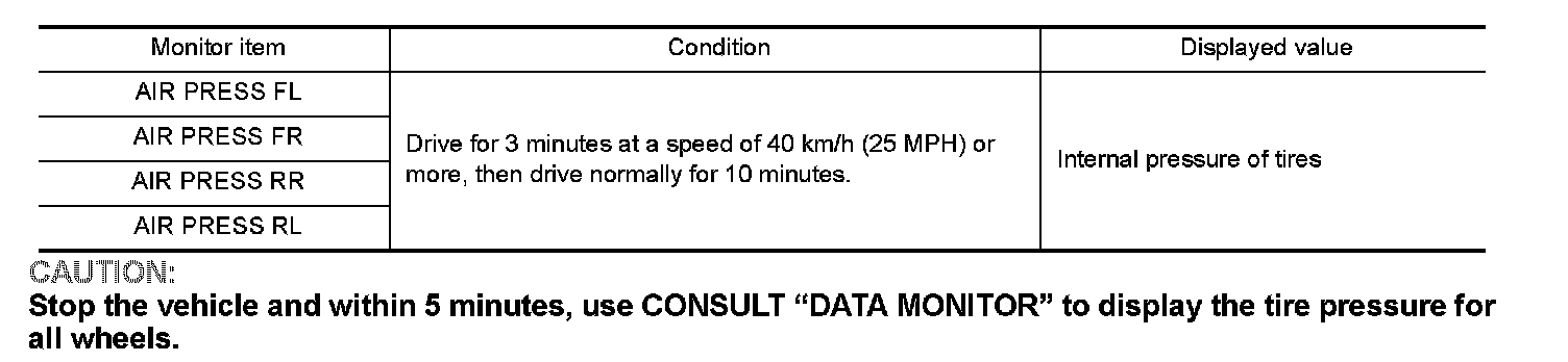 Stop the vehicle and within 5 minutes, use CONSULT "DATA MONITOR" to display the tire pressure for all wheels.